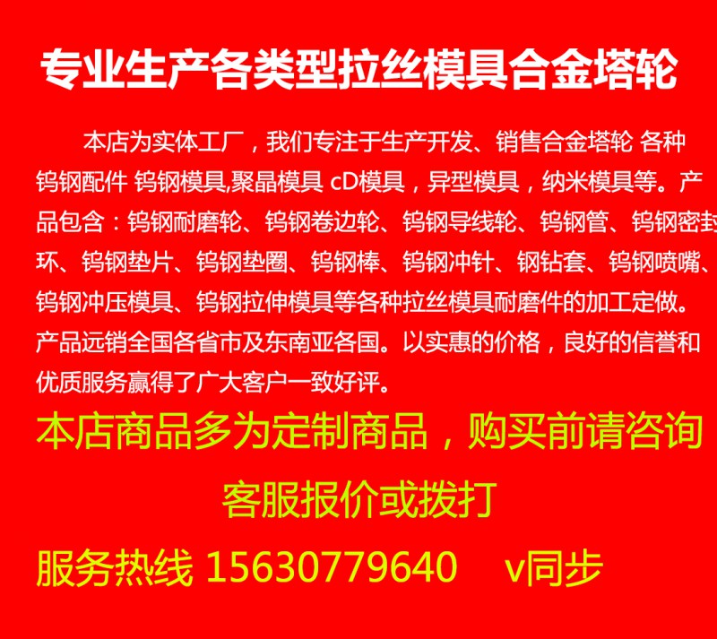 当前页为拉丝模具 硬质合金耐磨配件异型孔纳米涂层异性模具线缆模聚拉丝价格信息展示,该页所展示的拉丝模具 硬质合金耐磨配件异型孔纳米涂层异性模具线缆模聚拉丝批发价格、拉丝模具 硬质合金耐磨配件异型孔纳米涂层异性模具线缆模聚拉丝报价等相关信息均有企业自行提供,拉丝模具 硬质合金耐磨配件异型孔纳米涂层异性模具线缆模聚拉丝价格真实性、准确性、合法性由店铺所有企业完全负责。工厂在线对此不承担任何保证责任。